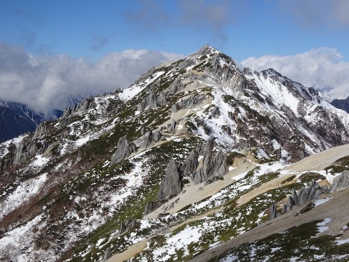 朝のうちは見えなかった槍ヶ岳もお昼ごろから姿を現わしました。この時期には珍しく、稜線の東側にはガスが湧いていました。夏ならいつものことなのですが、冬にこのような光景が見られるのは珍しいことです。