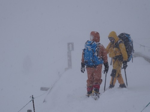 朝から厳しい天候となり、みなさん足早に下山されていかれました。今日は風向きがいつもと違い南東方向からで湿った雪でした。吹き溜まりでは積雪がぐっと増えたようです。