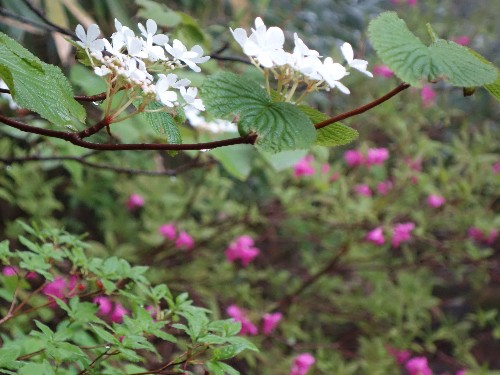 雨で登山道がえぐられてしまうのを防ぐため、第3ベンチあたりまで水を脇へ流す道を堀に行ってきました。すると富士見ベンチの少し下にはオオカメノキとムラサキヤシオツツジが並んで花を咲かせていました。これらの花は5月の上旬に登山口あたりで咲いていましたが、ようやくここまで上がってきたようです。同じ花をまた楽しむことが出来てなんだかうれしくなりました。