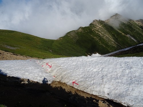 東天井岳直下を回り込む場所は、他の場所に漏れず例年よりうんと残雪量は少なく、その分カッティングの必要もなく、赤のラッカーで印をつけるに留まりました。当面常念小屋~大天荘の間、雪の上を歩くのはここ1か所のみ。とはいえここも、直に雪は無くなりそうです。