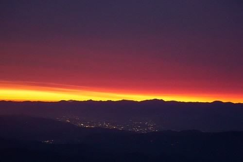 中々天気の安定しない今年のゴールデンウィーク、今日は早くも天気は下り坂へと向かいました。そんな時に見られるのが、この真っ赤な朝焼けです。美しいを超えて不気味な感じがしてきます。長野の街の灯りがまだ消えぬ、朝4時頃の写真です。結局、日の出はなく終日太陽が顔を出すことはありませんでした。