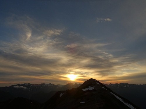 ▲大天井岳と背後鷲羽岳にさしかかる夕日