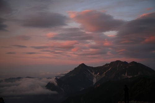 穂高連峰の上空には、レンズ状の雲がたくさん、朝焼けとなって出現。なるほど、日中の天気へと連鎖させるものあったわけです。