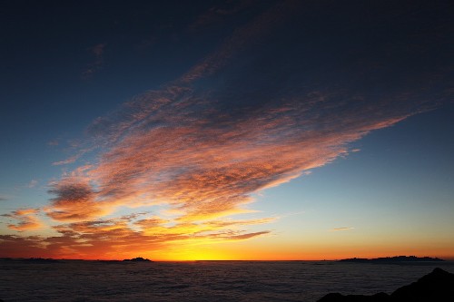 小屋の前から望むご来光もいいのですが、やっぱり山頂から見るほうが、広がり感があり、いいですね。