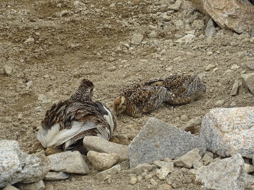 場所は大天荘のテント場。雷鳥の母親がどこかに佇んでいます。どこにいるでしょうか?