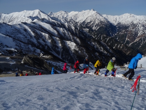燕山荘スタッフガイドのもと、合戦尾根を登ります。雪の上はアイゼン歩行の練習。