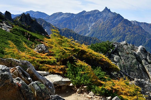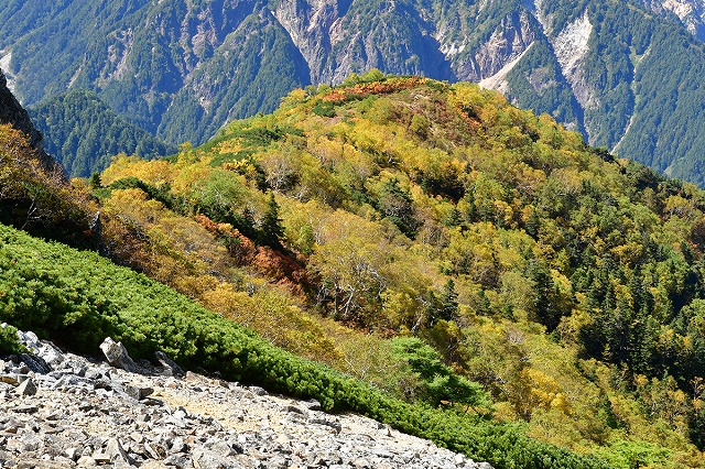 燕岳の西斜面の紅葉は風が強いのかナナカマドが少なく、ダケカンバが中心になります。私の好きな絶景ポイント大下りの頭まで行ってみました。ここは燕山荘にご宿泊され下山される方にお勧めです。片道約1時間です。