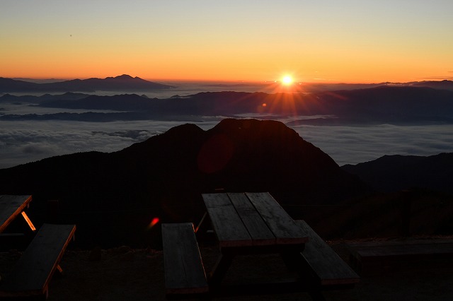 ▲燕山荘玄関前から望むご来光もだいぶ浅間山から離れ、冬至の位置に近づいてきました。