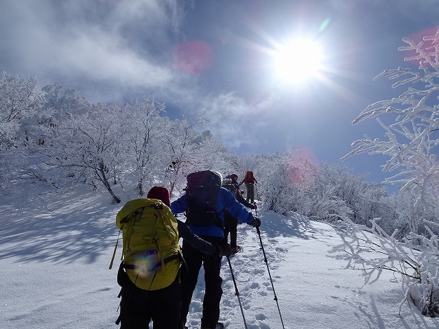▲瑪瑙山と飯縄山との標高差は200mもありませんが、なかなかのアップダウンで登り応えがあります。それでも、目指す飯縄山を仰ぎ見る時、眩しい陽ざしと青空と、真っ白な樹氷、それらの美しさが疲れを吹き飛ばしてくれます。