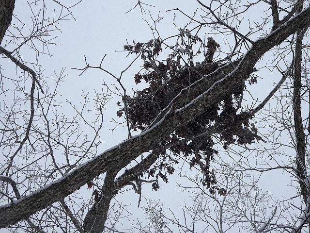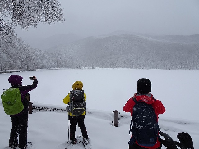 ▲最終日は南岸低気圧の影響を受けて、粉雪舞う中、黒姫山の懐に佇む古池周辺を、ネイチャーウォッチングしながらのスノーハイク。