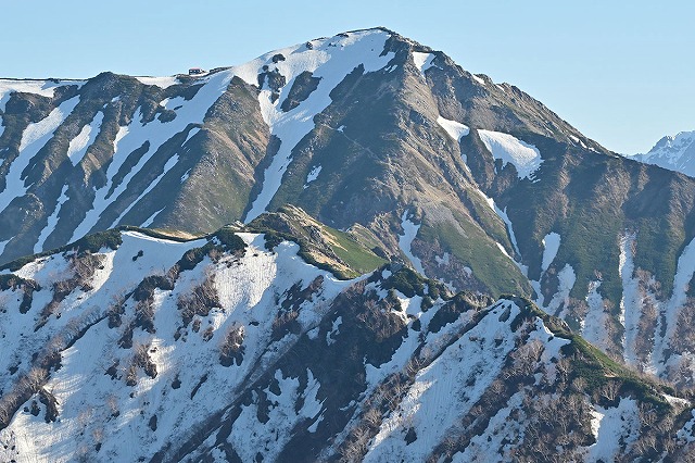 ▲大天井岳の雪も解け、大天荘がはっきりと見えて来ましたが、必ず頂上を経由してください。トレースがあっても夏道へのトラバースルートは危険です。