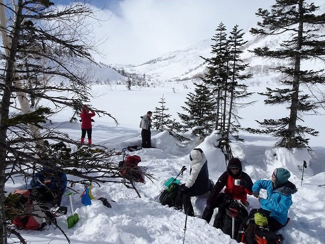 風雪を樹林の中で凌ぎながらランチタイムとなりましたが、その間にこれまた急速に視界が開け・・・