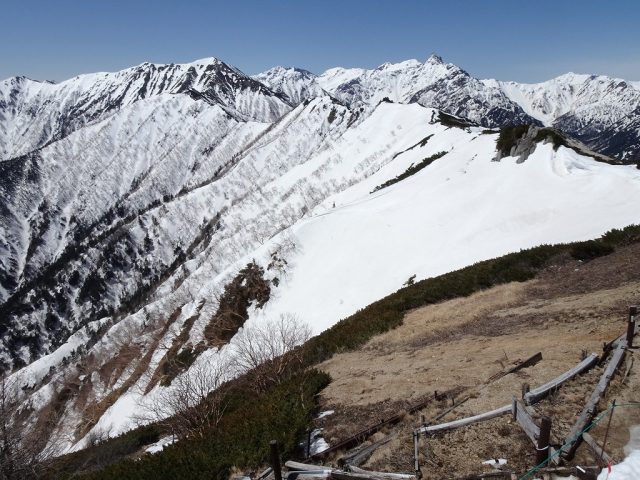 合戦尾根の残雪量は、ここ数年と比較しますと相変わらず多い状況です。下記に、4月24日現在の登山道状況をお伝え致します。しかし、ここ一週間ほどは朝晩の冷え込みが弱く、加えて雨の影響もあり、雪融けはスピード感を増して進んでいます。日中陽ざしが出ますと、合戦小屋~燕山荘の尾根歩きは、雪の踏み抜きで思わぬ体力の消耗、強いてはかなりの汗をかかないとも限りません。想定以上の所要時間がかかります。日の入は18:20頃、日の出は5:00前後です。