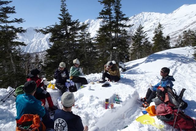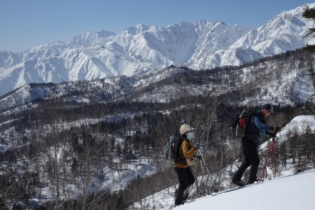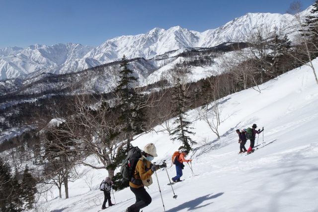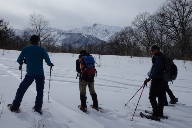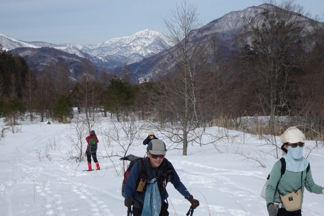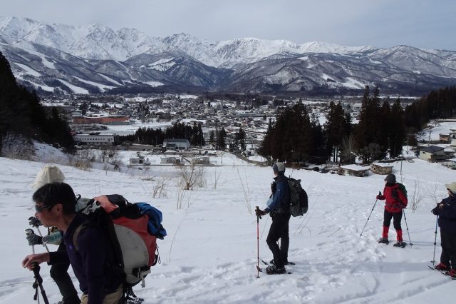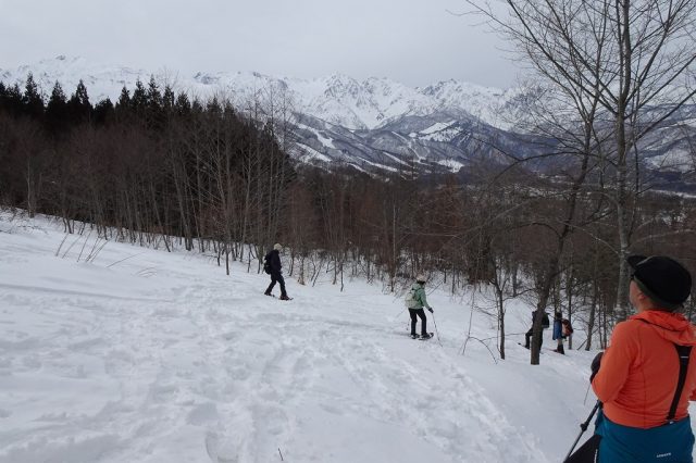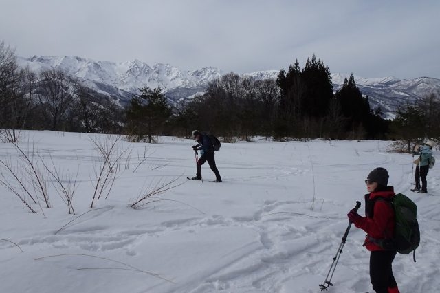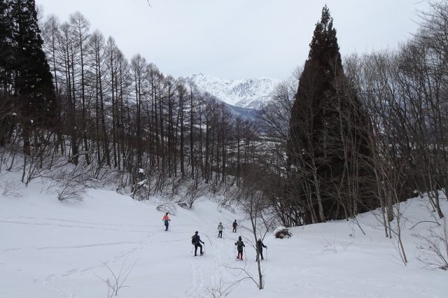 気温が高めだったため、雪質はかなり重かったですが、里山ならではの原風景や北アルプスの景色を楽しみながら、翌日に向けてのいい足慣らしとなりました。