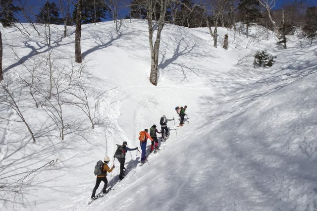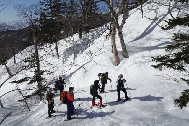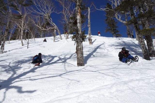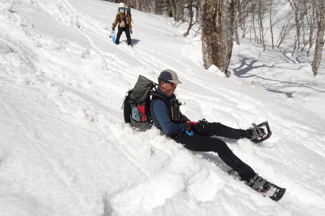 朝一こそ適度な硬さの雪面で、快適に標高を稼ぎますが、徐々に雪質も緩み始め、時々スノーシューの“歯”が効きにくくなり、汗ばむ始末。贅沢な話ではありますが・・・
