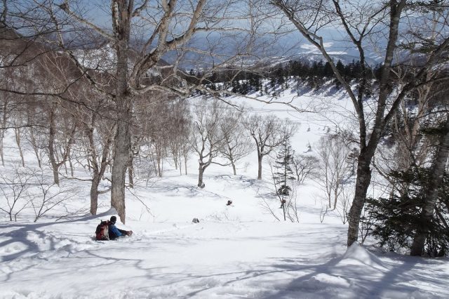 戻りはほぼヒップそりで滑りっぱなし。解放感ある斜面なので、雪の状態次第ではどこを滑っても問題なし。
