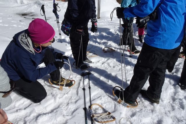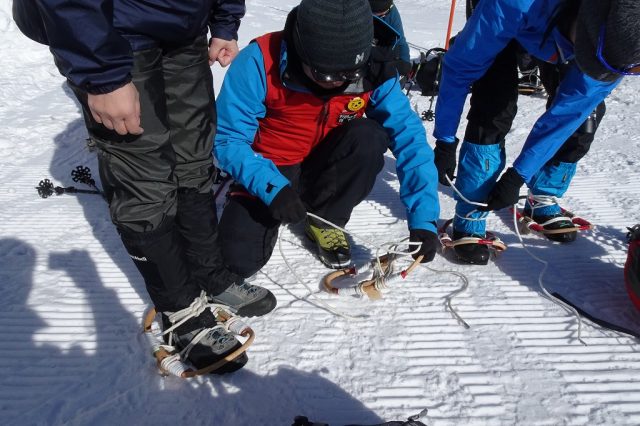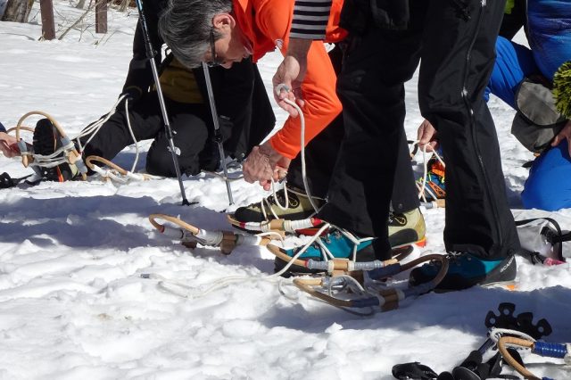 このツアーでは、スノーシューではなく、昔から伝わる輪かんじきを着装して歩きます。