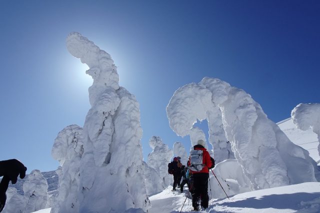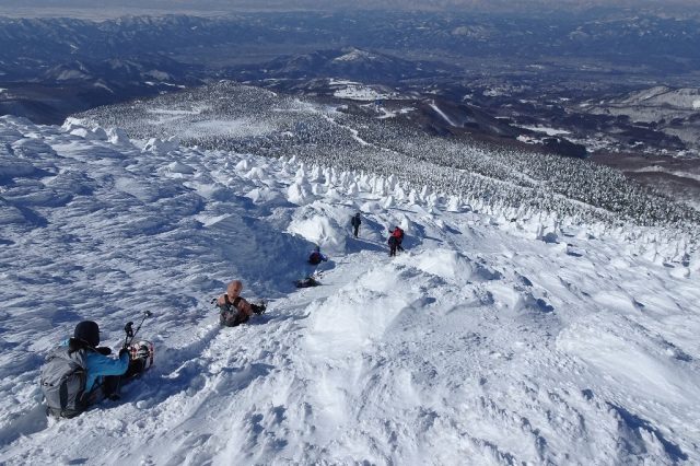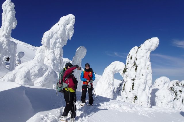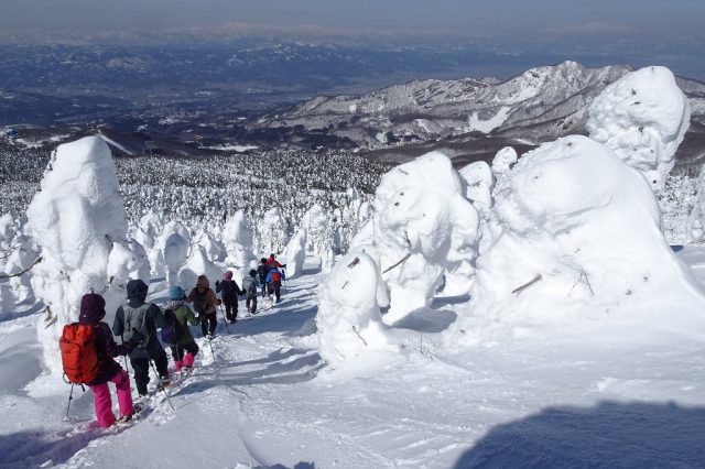 1回目は快晴無風という絶好の鑑賞日和となり、ロープウェイの山頂駅から地蔵岳の山頂まで樹氷の間をハイクアップ。月山や朝日連峰の遠望がよく効きました。