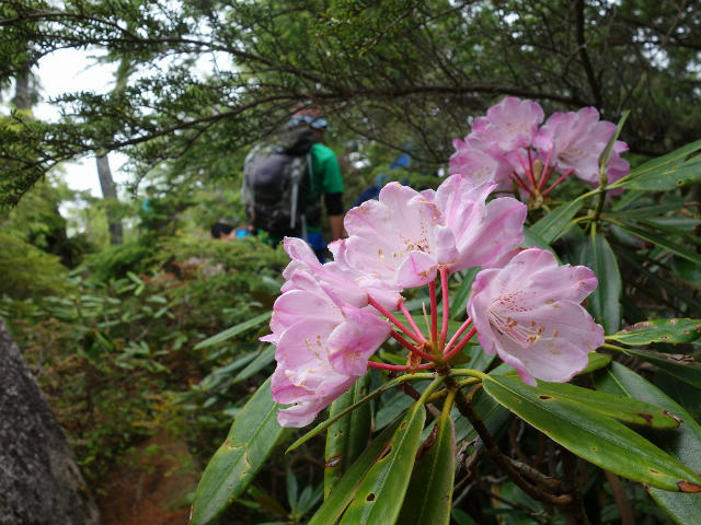 一方で、山頂界隈のシャクナゲは、ちょうど見頃を迎えていました。例年だと中腹辺り、標高2,000m辺りが見頃となるわけですが、今年は残雪量並びに雪融けが速かったこともあり、芽吹きも早かったためでしょうか。