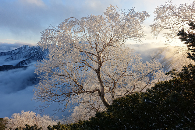 天気予報も燕山荘の連絡も風雪とのことでしたので、合戦小屋でゆっくりして登っていたところ、劇的に天気が回復。見事な霧氷がつく合戦尾根になっていました。太陽の光を追いかけて三角点から足がつりそうになるほど息せき切って登り何とか日没に間に合いましたが、いつも撮り慣れているカメラでなかったのが残念。自然は何が起こるか分かりませんね。