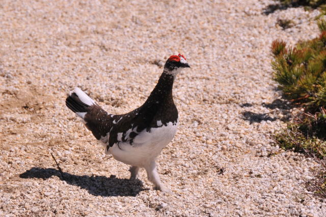 晴天の中の雷鳥のオスです。この雷鳥は体は大きくないのですが、なかなか威勢がよく、天敵にもめげず、岩の上で縄張りを主張しています。6月は訪れる登山者の方も少なく、また、日が長くのんびりした登山ができます。