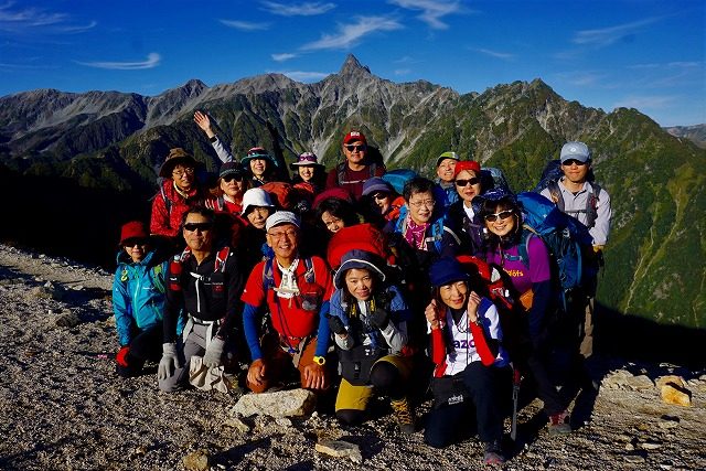 あこがれの槍ヶ岳に登頂です。皆さん、本当にうれしそうでした。遠くには小さくなった燕山荘も見えて、よくこんなに遠くまで歩いて来たなと喜んでいらっしゃいました。縦走の素晴らしさはやはり、この達成感なんでしょうね。