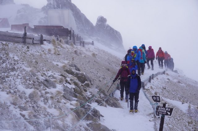 燕山荘西側の風の強いところを歩くツアーの皆さん。
