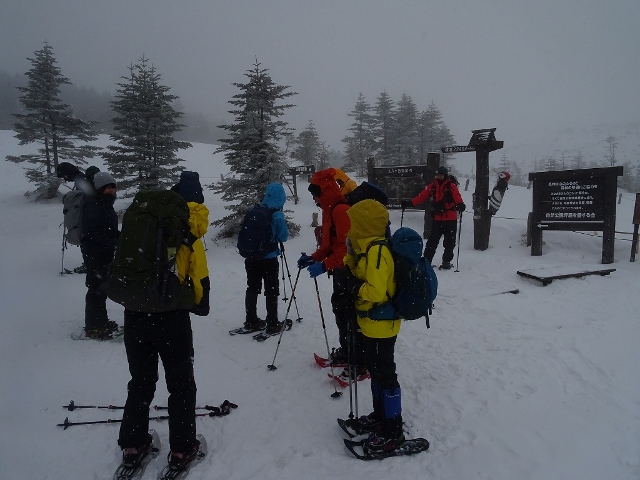 天気予報では南岸低気圧による影響が心配されましたが、降雪ではあったものの、降り方は弱く、風がほとんどなかったので、心置きなくスノーシューの操作性や履き心地等、初日の足慣らしハイクとしては、快適に歩を進めることができました。