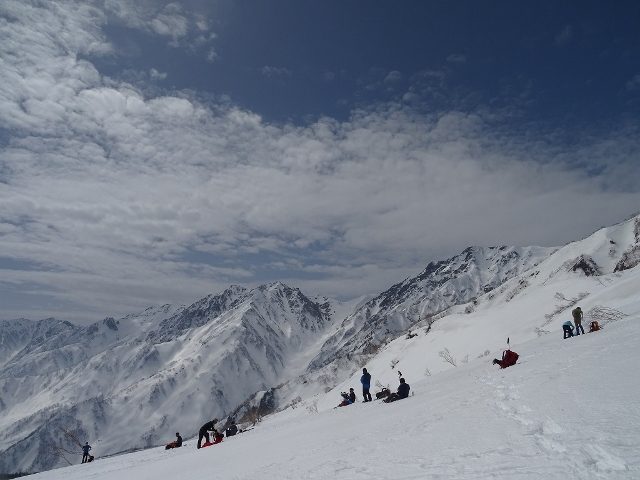 昼前に展望湿原に到着。この景色だけでも十分なおかずになりえます。何せ“無風”という最高のコンディション、ほどよい春の陽ざしもありで、ついつい大の字になりたくなります。白馬三山から唐松岳・鹿島槍ケ岳方面、北アルプス北部の主稜線の眺めが最高でした。