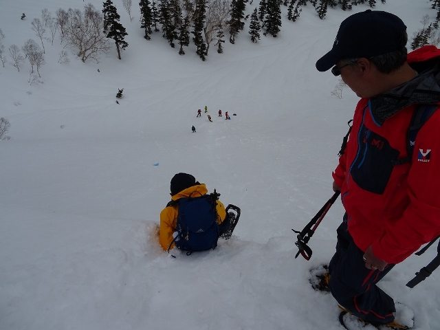 帰りは、このツアーの恒例でもあるヒップそりを使っての尻セードで下山。老若男女、 “年”を忘れておもいっきり雪まみれになっている皆さん、見ていてこちらがほのぼのします。