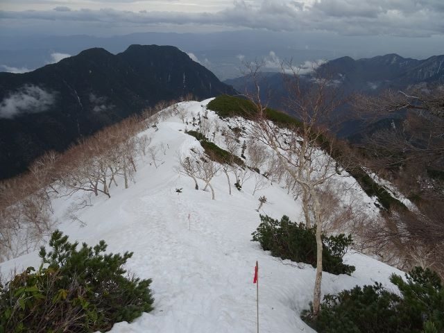 雪の上を絶えず踏むようになるのは第三ベンチから上部です。晴れた日中や雨天時はかなり雪が柔らかくなり、膝上まで踏み抜く箇所があり、アイゼン装着時、もし転倒などしてしまった場合には思わぬ怪我を招くことがあり注意が必要です。また、晴れた日の早朝は冷え込みやすく、逆に雪面はガチガチに凍結し、特に下山時はしっかりとしたアイゼンワークとピッケルの携行が欠かせません。