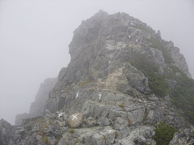 ▲槍ヶ岳の穂先の下に着くころにはガスに包まれて展望がなくなってしまいました。
