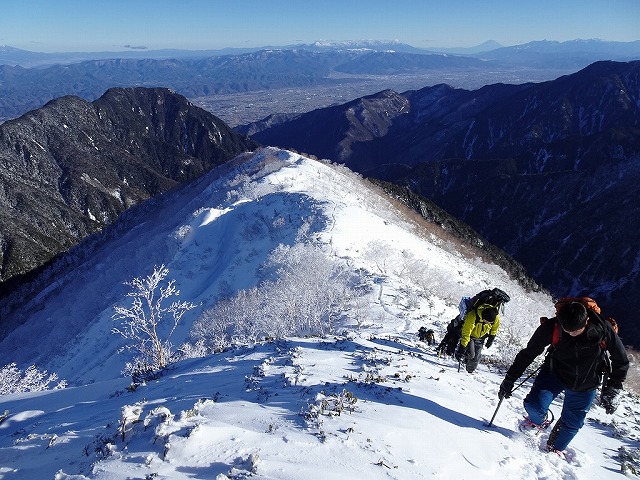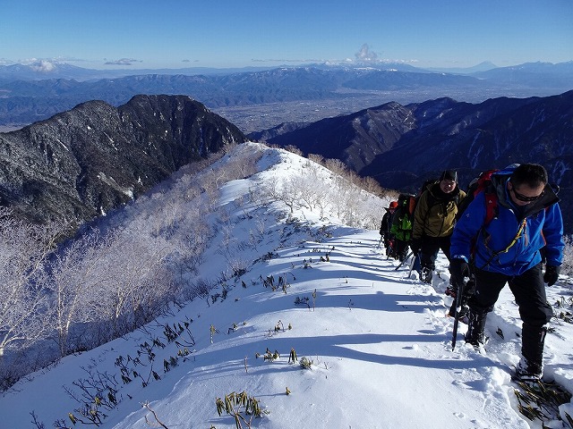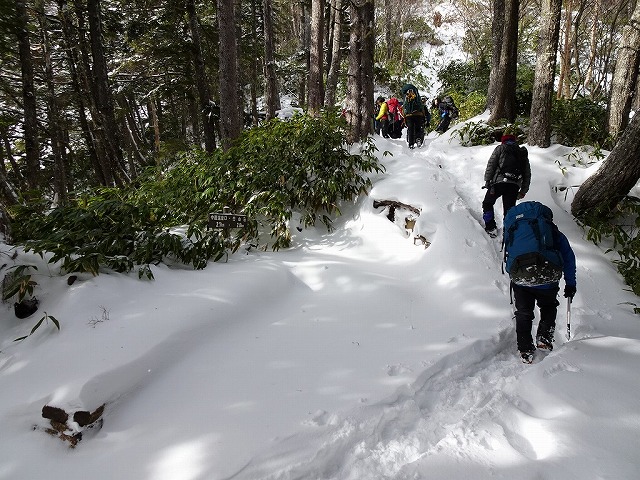 全体的な積雪量は確かに少な目ではありますが、ここが注意すべき点で、「雪が少ないから簡単に登れる」わけでは決してありません。降雪直後では、わかんを必要とされるぐらいのラッセルを強いられることはしばしばです。わかんはアイゼンの携行並みに大切ですし、もっとわかんを多用するといいでしょう。