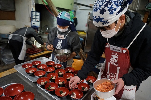 一番は、お正月のお餅つきです。元旦と二日の二日間つきます。元旦は悪天候で土間にての開催でしたが、大勢のお客様に見守られながら、熱気溢れるお餅つきとなりました。標高2,700mでのもち米の扱いはなかなか難しいところではありますが、一手間二手間でなんとか蒸しあがったもち米を力込めて突きあげます。突きたてのお餅は格別、あんこやきな粉とお好みで、その場にいたお客様にはもれなく召し上がって頂けました。