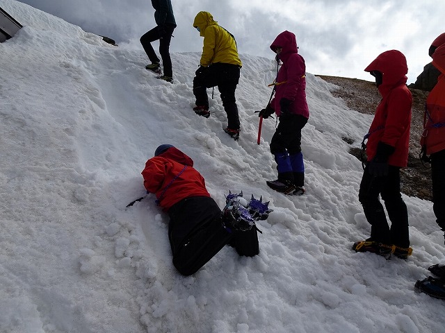 同時に、いざ滑ってしまった際の対処法の一つである「滑落停止」の技術は、正しいアイゼンやピッケルの使い方が大切になってきます。この春山登山教室では、その基礎的な内容をレクチャーさせて頂き、雪上歩行のバランス向上を狙います。