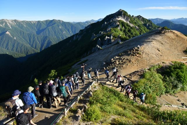 長野県の学校登山の歴史は古く、新田次郎著「聖職の碑」は大正2年(1913年)の出来事です。1956年燕山荘の第一別館ができ200名収容できるようになってから県内中学校は年間50校以上の学校が学校登山を実施してきました。コロナ禍もあり今年の県中は地元穂高東中学校の皆さん1校のみとなりましたが、他に東京世田谷の成城学園中学校、長野県の大町岳陽高校、上越市の高田高校の皆さんが登ってこられました。