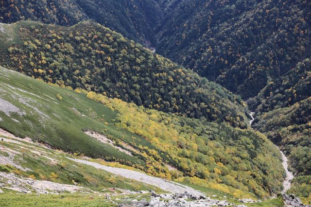 大天井岳から流れ出る二ノ俣谷、ダケカンバの黄葉が際立ちます。