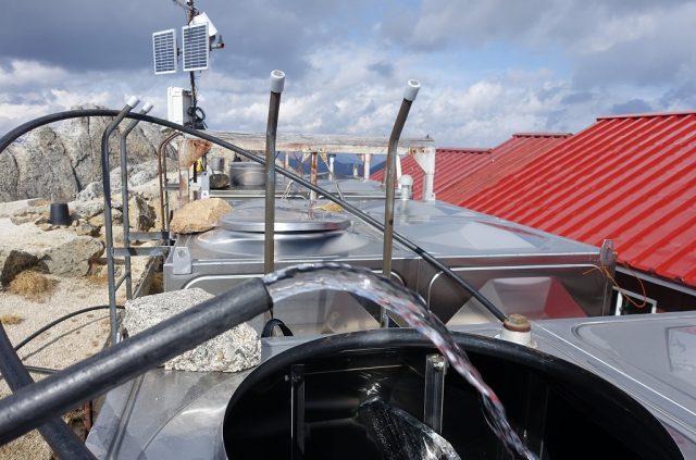 水源地へ向かう道中よりの燕岳。今シーズンの営業もあとひと月余りとなってきました。今、タンクに貯えてある水でギリギリ足りそうなんですが、念ためもう少し貯めておきたいところ。昨日も動噴にお湯をかけて水揚げを試みたのですが、上がらず。一度気温が大きく下がってしまうとその後は凍結により水揚げが出来なくなることが多いものです。10/22に-9℃まで下がっています。今日だめなら諦めようと思っていたのですが、パイプの破裂箇所を発見出来て、それを直したら水を上げることに成功。本当にうれしい瞬間でした。これで約56トンの水を確保して今シーズンの水揚げを終了出来ました。