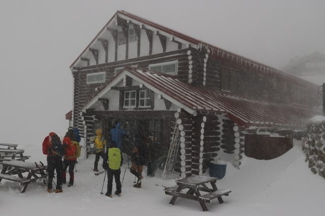 昨夜はい天気だったのですが、朝になると吹雪模様になっていました。山頂を目指された方々も強風によりすぐに戻られてきました。この強風では仕方ありませんね。冬山では無理をしないことが大切です。
