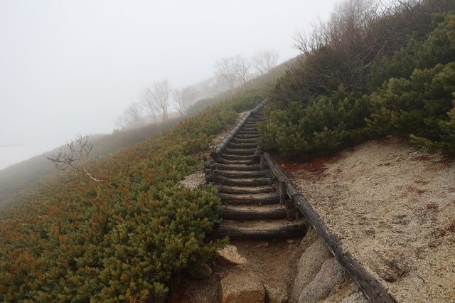 夕方、冬期小屋近くでは朝見たのとは別のライチョウを見かけました。こちらはまだ白く、雪の上にいれば目立たないのですが、雪のない所へ来ると白さが目立ってしまっていました。霧で霞み、展望がほとんどない1日でしたが3羽のライチョウに出会えてよかったです。ゴールデンウィーク中日、ちょっと一息な1日でした。