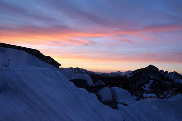 高気圧に覆われて穏やかな晴れとなりました。今朝は氷点下にはならなく冷え込みも強くはありませんでした。4時35分頃太陽が昇ってくると、雪面がオレンジ色に美しく染まりました。