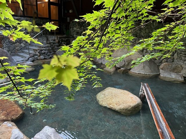 男子露天風呂では大きく葉を広げたモミジを、女子露天風呂では真っ白で大変美しいツツジを見ることが出来ます。