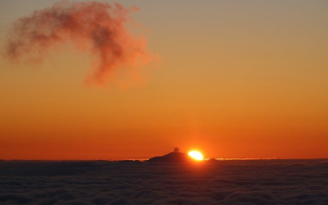そして、今朝は安曇野側にはびっしりと雲海が広がり、雲海の上からちょこっとだけ頭を出している浅間山の右側より、太陽は顔を出してきました。