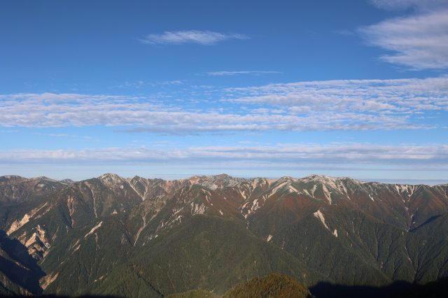 合戦沢の頭付近の拡大写真です。ダケカンバやカエデの黄色がきれいですね。一方、落葉も始まり出してきているようでダケカンバの白い木の幹が目立つようになってきました。
