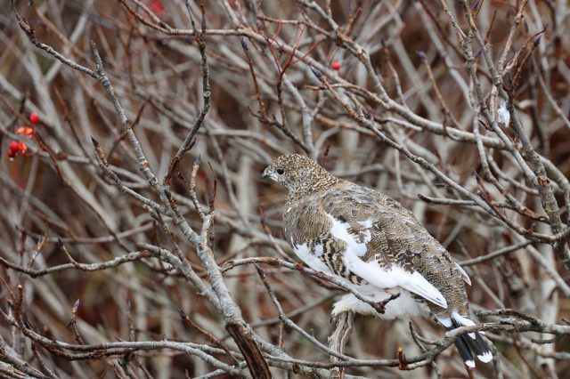 今日もナナカマドの木にはたくさんの鳥がやってきました。もっともよく来ていたのは、先日に続きアトリでしたが、今日はウソもよくやってきていました。エサを食べてすぐにいなくなるのですが、ちょっとするとまた戻って来てを繰り返していました。この鳥たちを見ていると別のナナカマドの木にはライチョウがやってきていました。こちらは先日に続き、3羽の群れでした。もしかしたらあの7羽の家族はもう別々になったのでしょうか。もしくは違う家族なのでしょうか、そこはちょっとわかりませんでしたが。連日姿を見せてくれています。