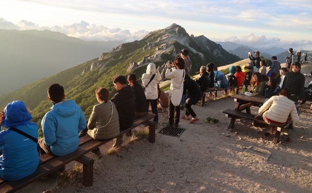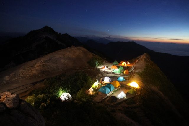 そして、一日の終わりは美しい日の入りでした。気温の上がった一日でしたが朝晩はやはり気温が下がります。この気温の下がり具合が季節の進み具合を感じさせられます。日の入りをご覧になられている皆さんの服装を見ているとなんとなく気温が想像できるかと思います。街で言えば秋のような気温です。ただ、日中は気温が上がるので小まめな水分補給がかかせません。登山において水分はとても大切なものです。