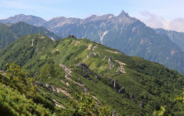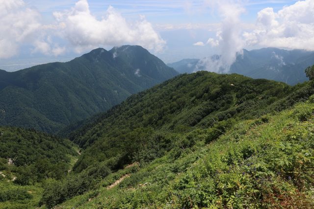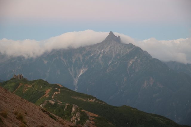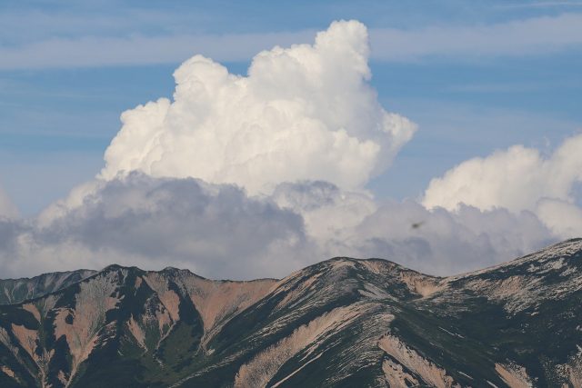 その強い風も10時頃にはだんだんと収まってきて、その頃より気温も急に高くなってきました。薄手の長袖を着ていたのですが、半袖で充分だなと感じて、玄関先の温度計を見れば20℃を越えていました。この燕山荘周辺では20℃を越えると暑いなと感じる気温です。そして、安曇野側の谷底からはセミの鳴き声も聞こえてきて、夏はまだまだ続いているなと感じさせられました。また、真砂岳の奥には発達した積乱雲が見られました。