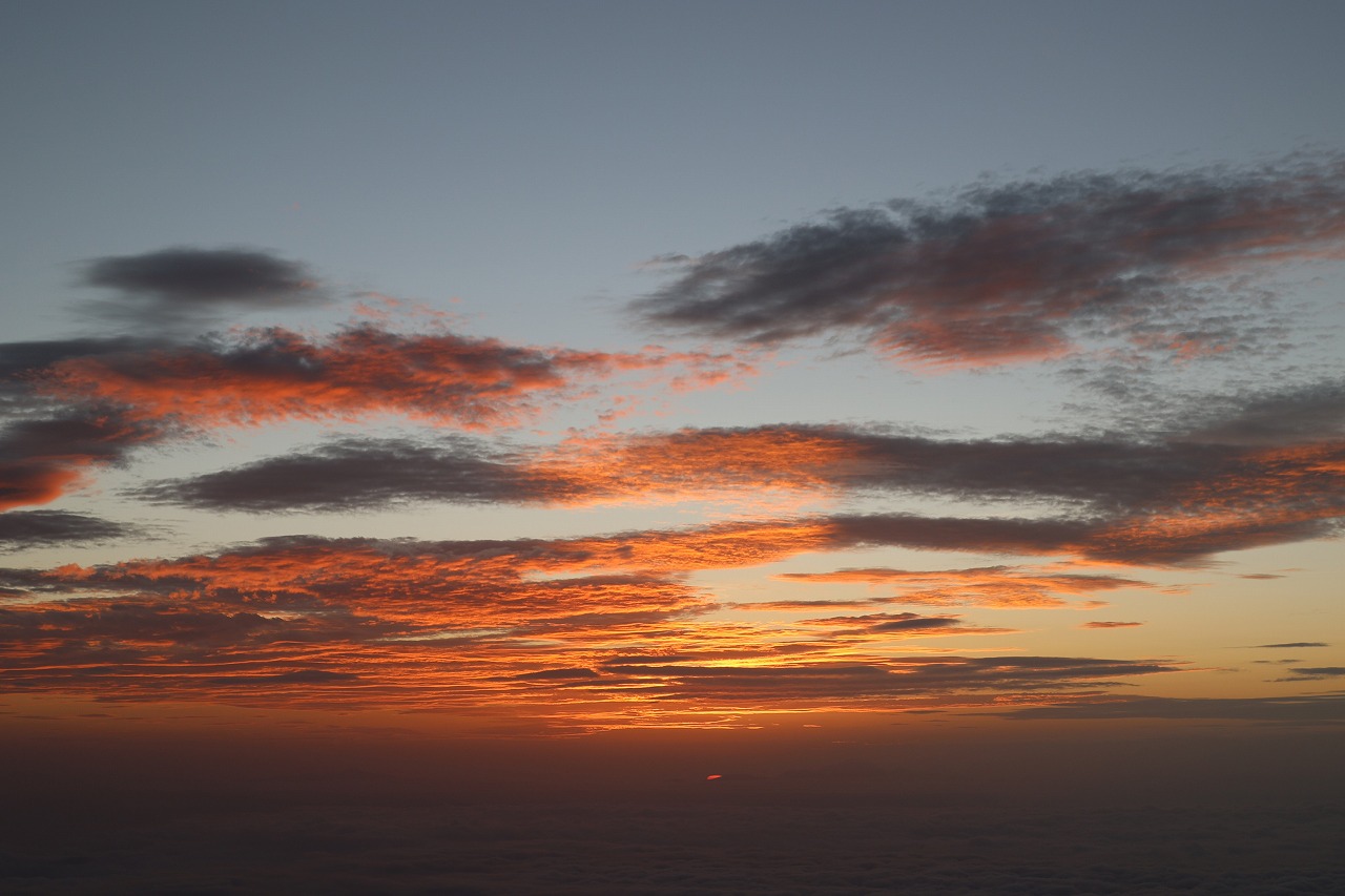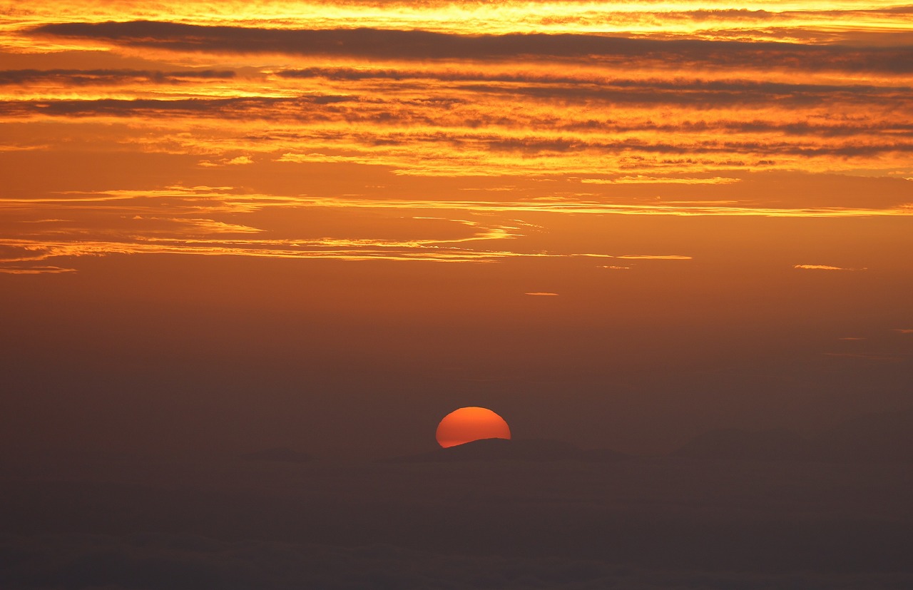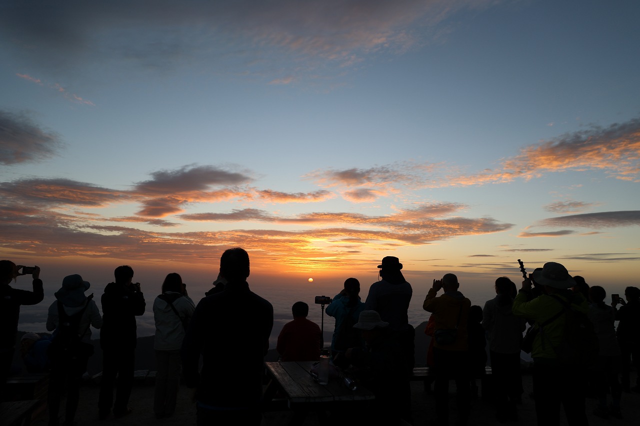 連休中は天気が悪かったのですが、今日は天気のいい一日となりました。雲が多かったのでご来光は期待できなかったのですが、日の出時刻頃になって、その方向に目を凝らすとぼんやりと太陽が昇ってきたところでした。