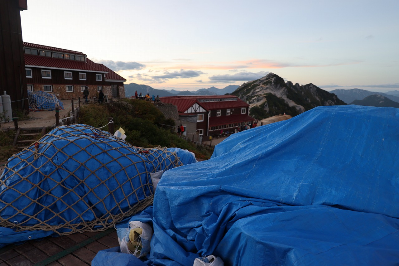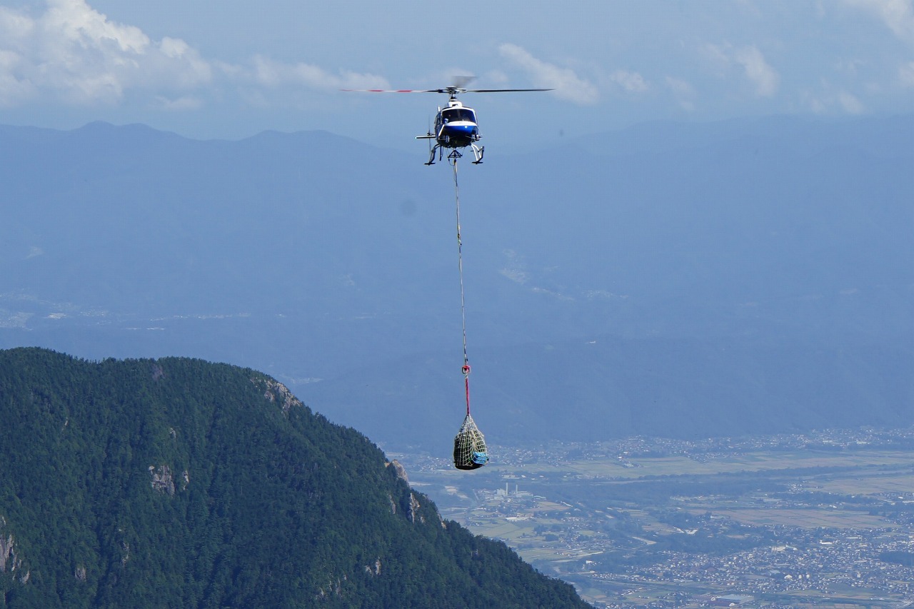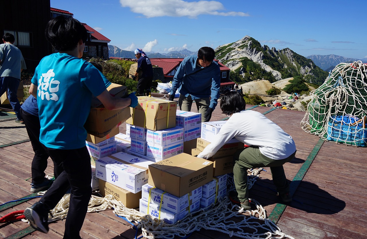 夏であれば9時を過ぎれば安曇野側はガスが湧き上がってしまうのですが、今はもう秋。お昼になってもガスの湧き上がりがありませんでした。そして、13時頃より待ち待ったヘリコプターによる物資輸送が始まりました。前日は男性スタッフ総出で食材を歩荷しに行ったのですが、ヘリコプターはその何倍もの量をいとも簡単に運んでくれました。改めてヘリコプター有難みを感じる時でした。