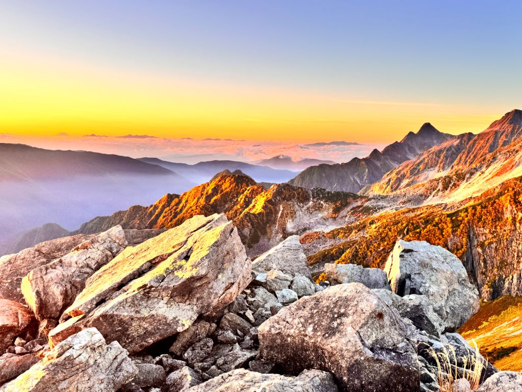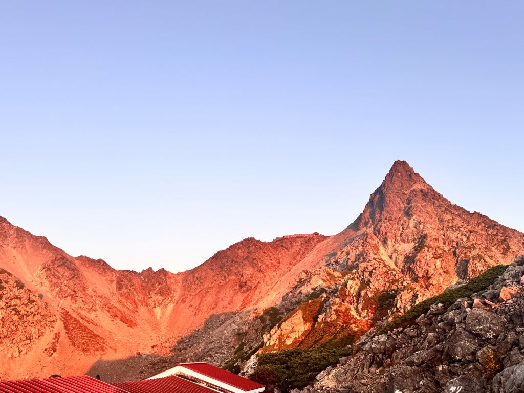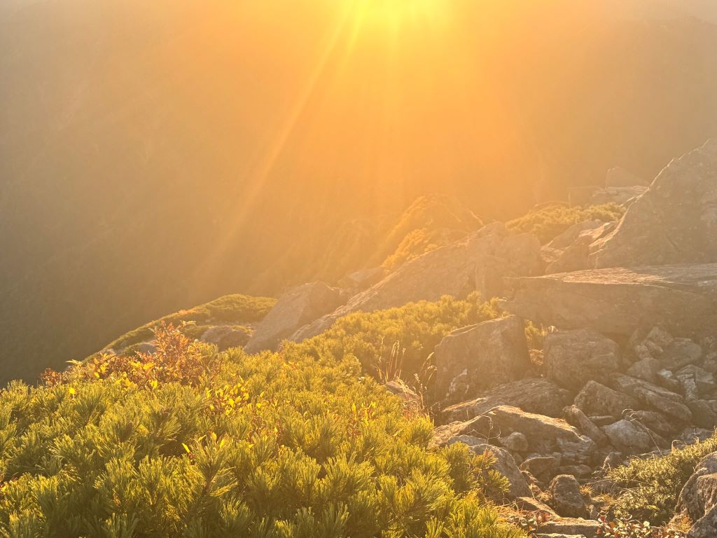足元のハイマツも岩も陽光に輝き、刻一刻と移ろう光の中で迎えた一日の始まり。